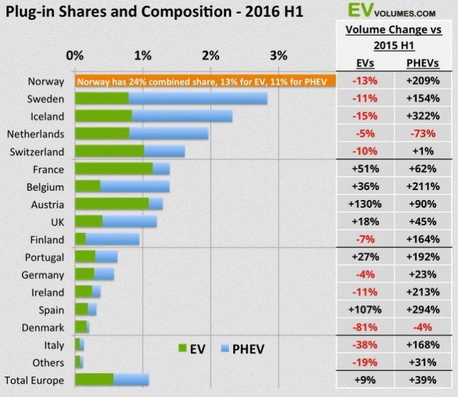Рост в других странах оставался достаточно сильным, в частности, в Испании, Австрии, Финляндии, Португалии и Бельгии. Увеличение числа продаж гибридов наблюдалось почти по всем направлениям, за исключением Дании и Голландии, в которой произошел резкий спад (-73%), что связано с изменением налоговой политики, которая несколько нарушает общую картину растущей популярности электрических транспортных средств.