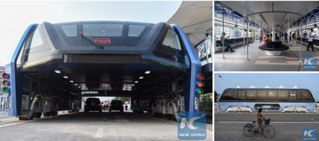 Идея подобного проекта (straddling bus) зародилась еще шесть лет назад, однако испытания полномасштабной модели состоялись только сейчас. Их провела пекинская компания Transit Explore Bus в городе Циньхуандао.