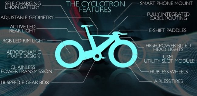 Одной из уникальных особенностей велосипеда Cyclotron, которая не может не бросаться в глаза, являются светящиеся голубые светодиоды в колесах, у которых нет спиц. Если прибавить к этому футуристический дизайн и легкую углеродную раму, то получится почти что мотоцикл из фантастического фильма «Трон». Велосипед можно заказать на Kickstarter, кампания по сбору средств еще продолжается.
