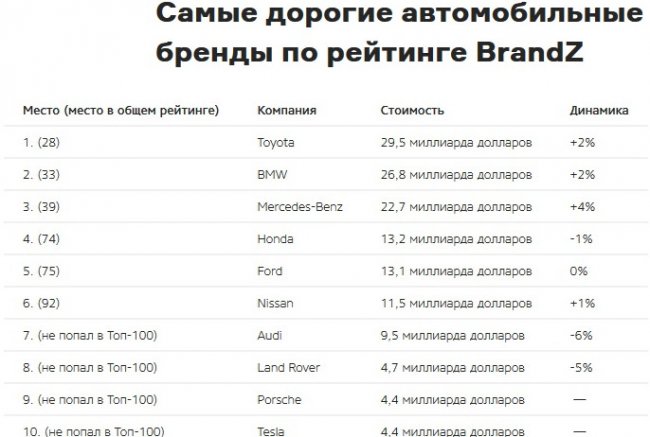 Топ самых дорогих автомобильных марок четвертый раз подряд возглавила компания Toyota с оценочной стоимостью 29,5 миллиарда долларов — на два процента больше, чем годом ранее. На втором и третьем месте, как год назад, идут компании BMW и Mercedes-Benz, стоимость которых составила 26,8 и 22,7 миллиарда долларов соответственно (на два и четыре процента больше соответственно).