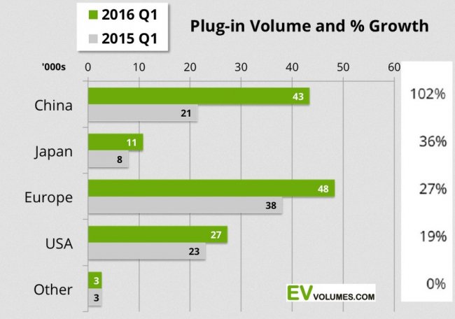 Локомотивом роста остается Китай, где «зеленые» машины благодаря политике государства пользуются устойчивым, прогрессивно растущим спросом. Согласно данным и прогнозам интернет-портала EV-Volumes.com количество экологичных авто в мире по итогам 2016 года должно превысить 2 миллиона машин.