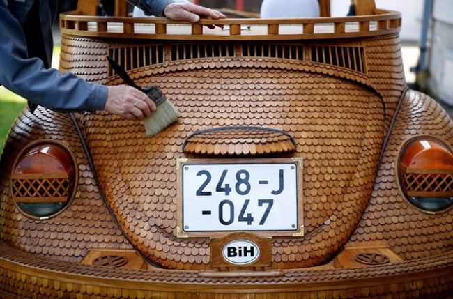 Босниец описывает свой деревянный Фольксваген как «любимую работу». Он начал с кузова обычного «Жука», а затем покрывал его черепицей из дерева и сделал деревянный салон, а также рулевое колесо, колпаки, которые также изготовил своими руками в мастерской в своем саду.