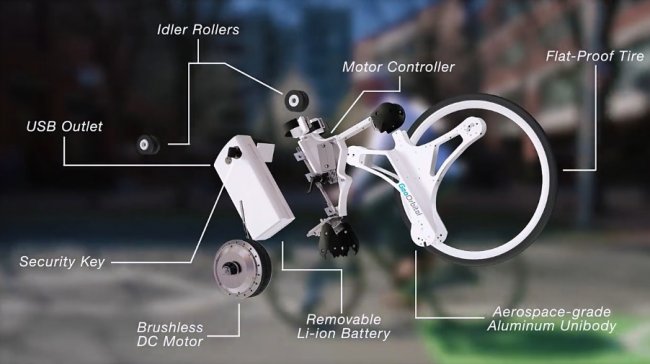 Устройство состоит из внешнего обода, на который надевается безвоздушная шина, электрического бесщеточного мотора, легкосъемной батареи и механических распорок с роликами. Приводной механизм размещается внутри обода. Вращение двигателя передается на ролики на распорном механизме, которые, в свою очередь, вращают внешнюю часть электроколеса.