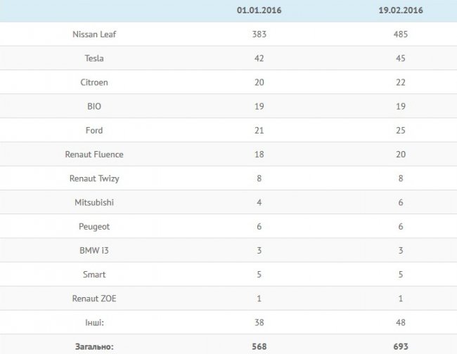 Согласно официальной статистики, на февраль 2016 года в Украине зарегистрировано уже 693 электромобиля. Общее количество электрокаров за полтора месяца увеличилась на 22 процента - прирост составил 125 машин, сообщает Electrocars. Для сравнения: последние цифры, которые портал публиковал в январе, показали, что официально в Украине зафиксировано 568 электрических авто.