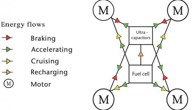 Свое детище разработчики называют также «сетевым» электромобилем (Network Electric car), поскольку энергия способна распространяться по автомобильной сети во всех направлениях, за исключением возможности ее поступления обратно в топливные элементы (см. схему выше).