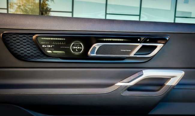 Перед водителем – распечатанное на 3D-принтере рулевое колесо и широкоформатная светодиодная приборная панель. Сиденья первого и второго рядов оснащены чувствительными датчиками, которые беспрерывно отслеживают состояние пассажиров и водителя. Полученные данные выводятся на дисплеи, размещенные во внутренней обшивке дверей, а также взаимодействуют с системой управления освещения в салоне разработки Kia (Light Emitted Rejuvenation, LER).