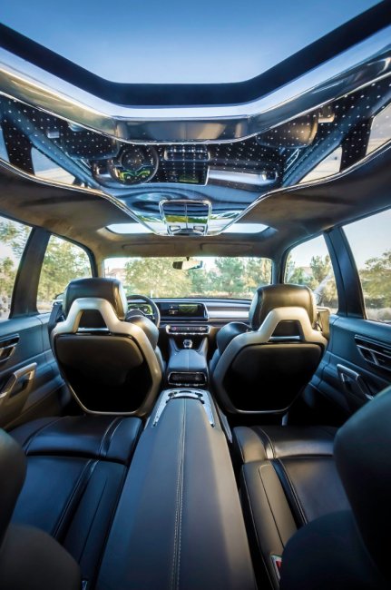 Большой вседорожник имеет три ряда кресел и двери, которые открываются в стороны на 90 градусов (центральная стойка отсутствует). Просторный интерьер авто представительского класса позволяет трансформировать кожаные сидения второго ряда в горизонтальные лежаки, которые также оснащены выдвижными подножками.