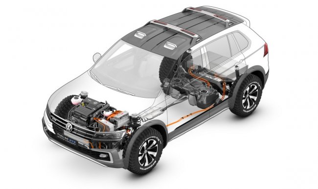 Вседорожник Tiguan GTE Active Concept оснастили 1,4-литровым турбированным бензиновым двигателем TSI, который вырабатывает мощность почти в 150 л.с. В комплекте с ним идут два электромотора — мощностью 54 л.с. на передней оси и, соответственно, 114 – на задней. Суммарная мощность гибридной силовой установки достигает 225 л. с.