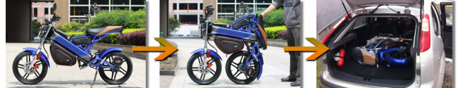 Привлекательной особенностью электробайка является легкая эксклюзивная рама и возможность его складывать. В таком компактном виде мотоцикл легко помещается в багажник автомобиля или транспортируется в лифте.