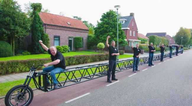 Чтобы велосипед-гигант смог проехаться по общественным улицам, дорожным службам приходится перекрывать движение и убирать с проезжей части все припаркованные там транспортные средства. Длина этого мега-байка составляет 35.79 метра.