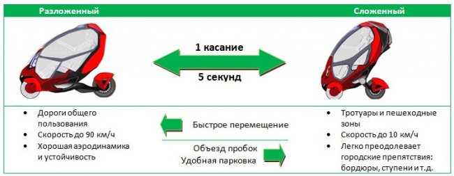 Единственное заднее колесо снабжено резервным гидравлическим тормозом, который дополняет электромагнитные тормоза передних колес. В разложенном состоянии заявленная максимальная скорость электрокара 90 км/ч (в сложенном – 10 км/ч). Разгон до 60 км/ч происходит за 5 секунд, а при желании можно активировать безопасный режим езды по пешеходным зонам.