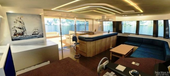 Помимо солнечных батарей, в комплектацию Solarwave 62 входит откидная крыша, 6-метровый гараж для небольшой водной техники, кормовая и носовая солнечные террасы, кухня и гостиная с легкой и изящной мебелью, а также от 3 до 6 кают для гостей и экипажа.