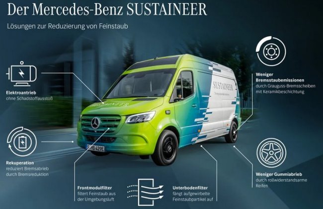 Представленный на днях автофургон Mercedes Sustaineer может претендовать на звание самого экологичного автомобиля: мало того, что он не производит вредных выбросов, в дополнение он также улучшает окружающую среду. В передней части кузова вмонтирована воздухоочистительная система, которая фильтрует воздух вокруг машины независимо от ее скорости. В нем даже используются чугунные дисковые тормоза с керамическим покрытием, которые уменьшают количество пыли в воздухе и ограничивают износ тормозов.