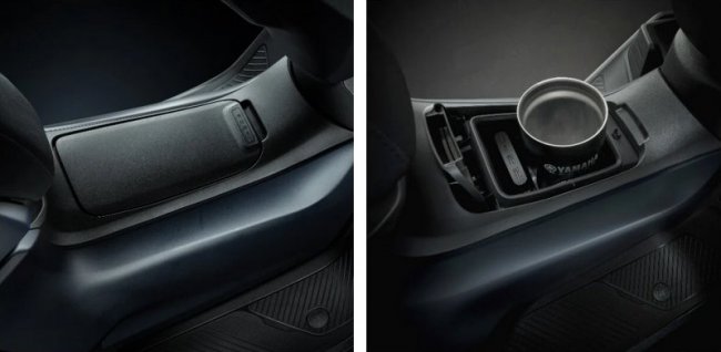 Скутер оснастили необычно отделом для хранения вещей, который разместили между ногами водителя. Он включает в себя подстаканник, а также место для мелких предметов, но не запирается в закрытом положении.