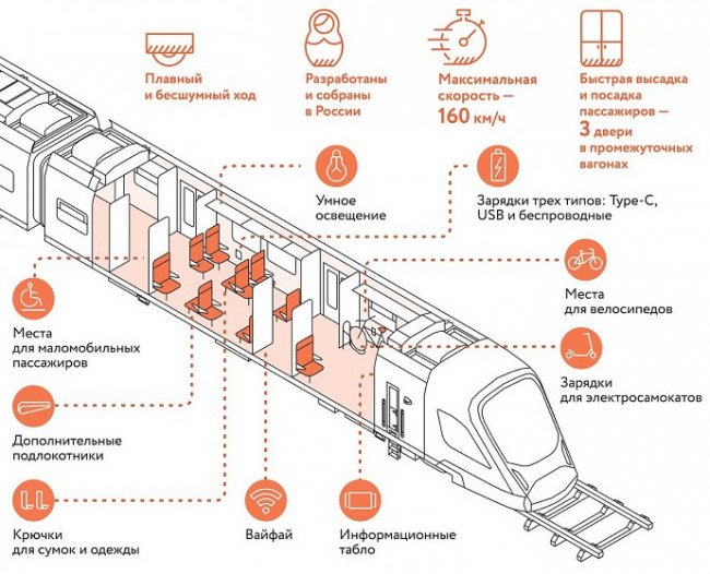 Также упоминается умное освещение салона, отдельные места для пассажиров с ограниченными возможностями по здоровью, крупное информационное табло в каждом вагоне, а также беспроводная сеть Wi-Fi.