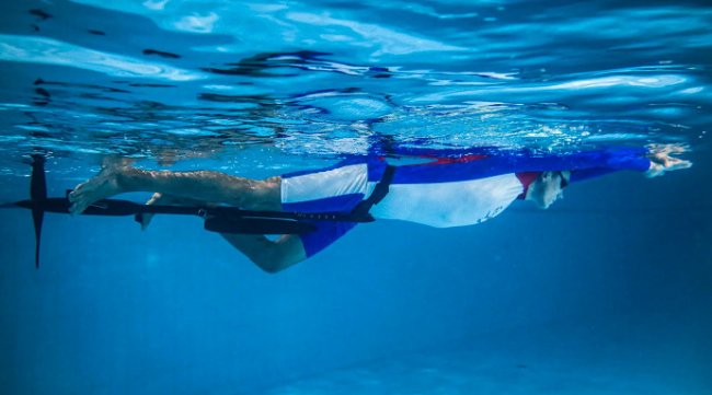 Название «подводный велосипед» прекрасно отражает суть приспособления. Это штанга регулируемой длины с ручками-упорами, педальным приводом и 38-см винтом на конце. Необходимо закрепить устройство на поясе и начать вращать педали, что обеспечит ускорение под водой. Руки остаются свободными, маневры осуществляются движением тела.