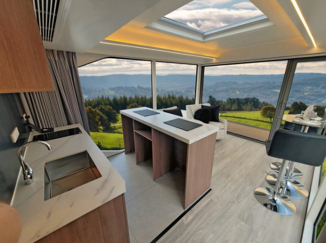 Внешне он напоминает жилище из научно-фантастических фильмов для участников инопланетных миссий. Размеры Е9 — 11,5 х 3,3 х 3,3 м, площадь — 38 кв. м. Вход — через дверь с умным замком, причем посетители сразу попадают в гостиную с современной минималистичной планировкой, встроенными светодиодными потолочными лампами, окружающими световой люк.