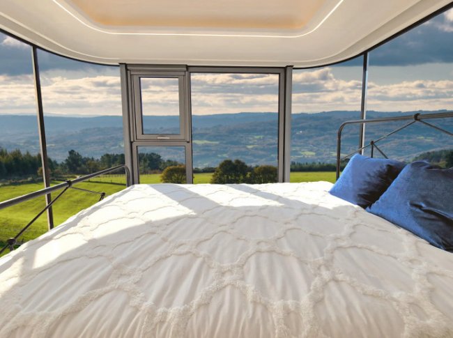 Из спальни открывается панорама с обзором на 270 градусов. Окна расположены по всему периметру Е9, обеспечивая прекрасное естественное внутреннее освещение, регулируемое автоматическими шторами. К дому подводится электросеть 220 В/150 А, от которой питается система кондиционирования.