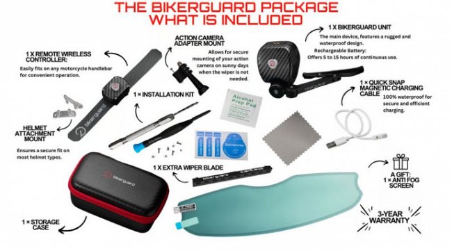 Словенский стартап Bikerguard предложил усовершенствовать визор мотошлема, оснастив его дворником. Дворник приводится в движение спрятанным внутри корпуса крошечным электродвигателем, который не мешает поднимать стекло визора. Bikerguard может включаться как нажатием кнопки на установленном на руле контроллере, так и по заранее заданному циклу с интервалами 10 и 15 секунд. Устройство легко снимается и хранится в удобном переносном чехле.