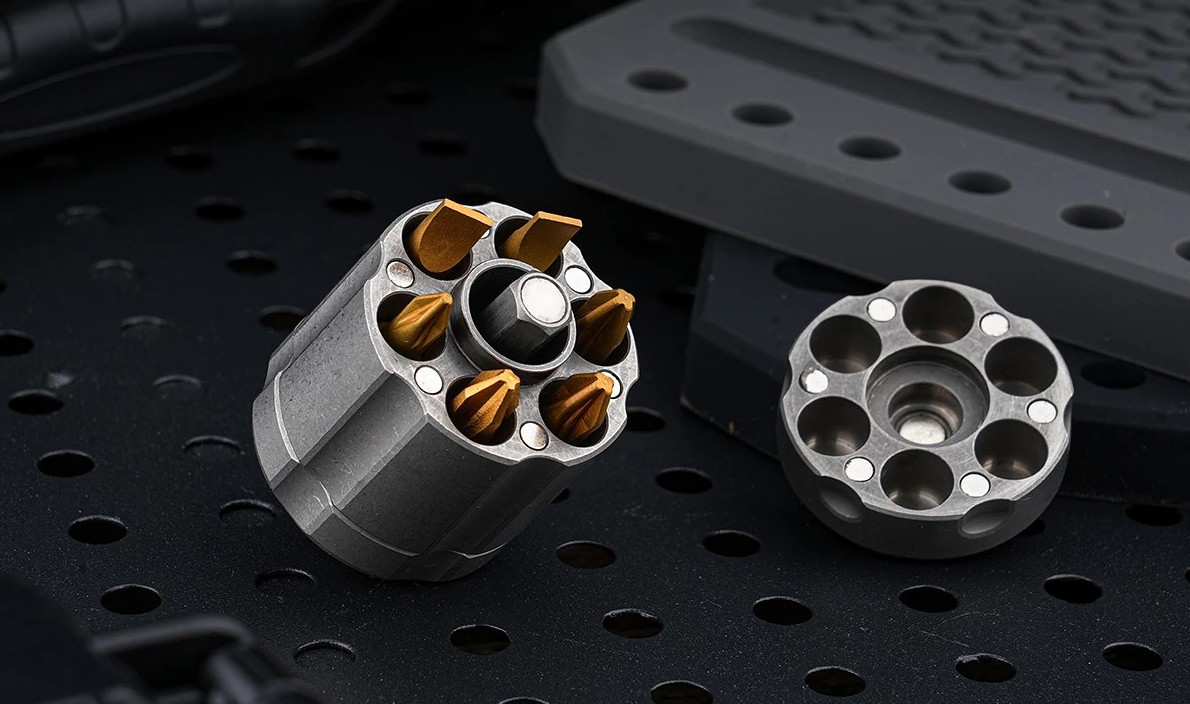 Компания IdealSpark, специализирующаяся на производстве инструментов, представила необычную титановую отвертку в виде револьверного барабана Revolver S. Его размеры всего 43 х 31 мм.