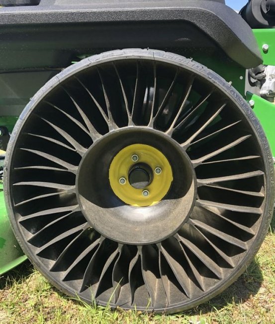 Новая модель газонокосилки Z740R ZTrak от компании John Deere получит вместо типовых колес инновационные покрышки Tweel. Их отличает особая пустотелая конструкция – здесь нет камеры для воздуха, вместо нее функции амортизатора выполняют спицы колеса. Они изготовлены из полимерной смолы — как и ступица, и внешний обод с рельефным рисунком.