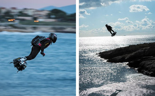 Изобретатель футуристического ховерборда Flyboard Air — Фрэнк Запата продемонстрировал возможности своего детища, совершив головокружительные полеты над Атлантическим океаном у берегов Соссе-Ле-Пен (Франция). Flyboard Air – устройство, позволяющее пилоту автономно летать на высоте до 3048 метров.