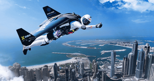 Французский пилот-экстремал Ив Росси, известный также, как Jetman, ранее прославился своими полётами на Гранд-Каньоном и Рио-де-Жанейро. Очередной головокружительный трюк он совершил в небе над Дубаи со своим партнёром Винсом Реффетом. Надев на себя реактивные ранцы, они произвели облёт летящего