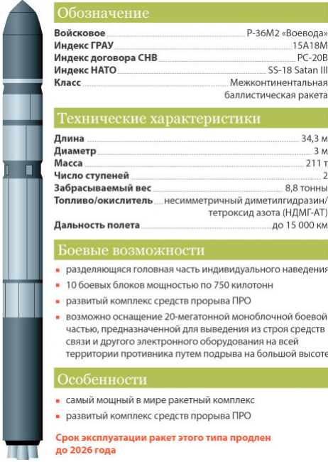 «Воевода» — оружие возмездия. По некоторым данным, из 350 стратегических ракет, стоящих сегодня на вооружении, пятая часть приходится на него. А через 3-4 года ожидается солидное подкрепление – стратегический комплекс нового поколения «Сармат».