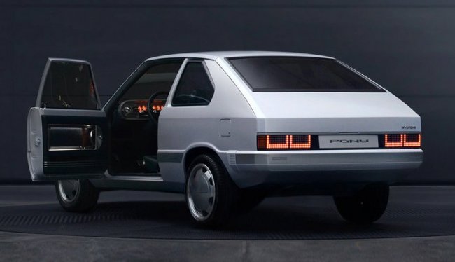 Снаружи кузов электрифицированного PONY покрыт матовой серебристой краской, обладающей мерцающим эффектом. Традиционные боковые зеркала заднего вида заменены на видеокамеры, расположенные на передних крыльях.