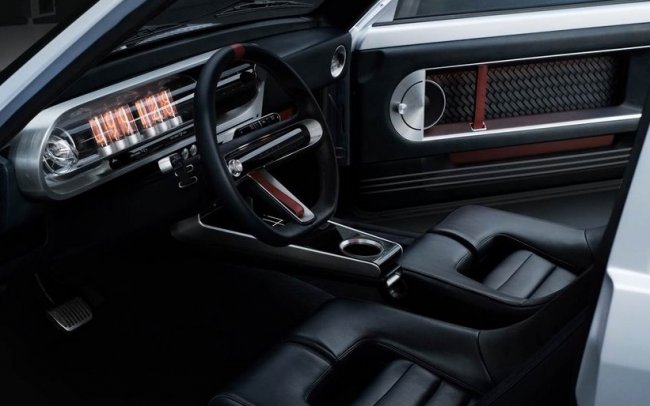 В салоне, в целом выполненном в ретро-стиле, выделяется концептуальная приборная панель. На ней цифры, обозначающие уровень заряда в аккумуляторе и скорость, отображаются на индикаторах в виде больших радиоламп. Винтажности интерьеру добавляют также металлические и кожаные элементы отделки. Современность и будущее внутри автомобиля представляют сенсорный дисплей на месте селектора коробки передач, ниша для смартфона и система голосового управления.