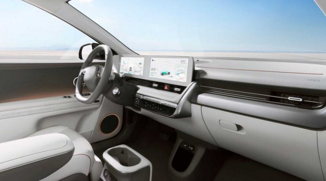 На передней панели электрокроссовера размещаются два 12,25-дюймовых экрана (щитка приборов и информационно-развлекательной системы), а также обычные кнопки. В качестве опции доступен 44-дюймовый проекционный дисплей.
