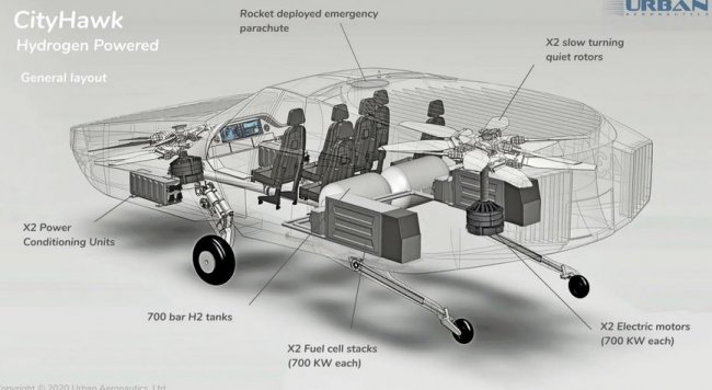 Кроме того, Urban Aeronautics заявляет, что ее транспортное средство, приводимое в движение за счет водородных топливных элементов, значительно тише и содержит на 20–30 процентов больше места в салоне, чем вертолет.
