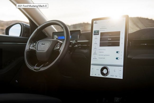 В Mustang Mach-E применено множество инновационных решений. Например, двери снаружи открываются по нажатию кнопки. На передней панели размещен вертикально ориентированный 15,5-дюймовый экран информационно-развлекательной системы. В качестве ключа от машины может использоваться смартфон. Совместимое мобильное приложение позволяет контролировать основные параметры электромобиля и управлять некоторыми функциями, например, открытием окон и пятой двери.