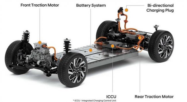 Базовая конфигурация E-GMP предполагает установку одного силового агрегата на задней оси. Для полноприводной модификации предусмотрен дополнительный электродвигатель спереди, который по желанию можно будет физически отключать от колес.