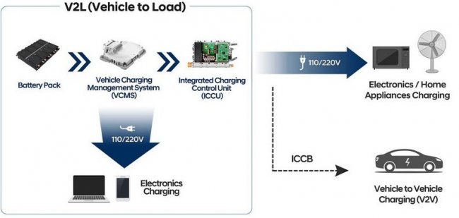 Электромобили Hyundai на E-GMP получат встроенный блок управления электропитанием. Он поддерживает зарядку как постоянным током при напряжении 800 вольт и 400 вольт, так и переменным током от однофазных и трехфазных зарядных устройств. Кроме того, от батареи электромобиля можно будет без установки дополнительного оборудования брать питание для любых электроприборов мощностью до 3,5 кВт, рассчитанных на подключение к бытовой электросети на 110 или 220 вольт.