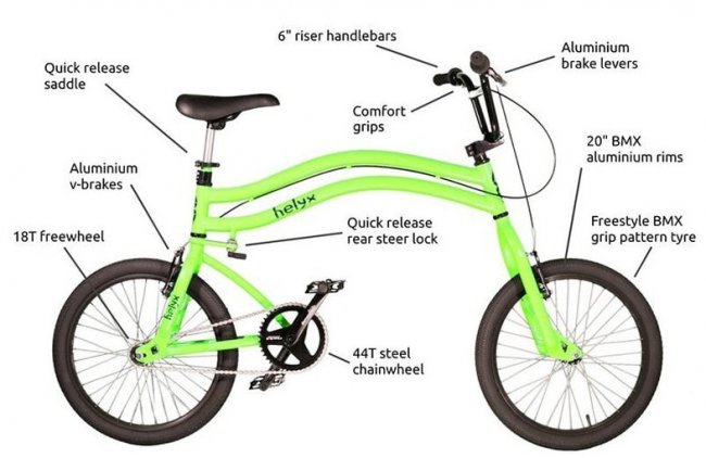 На Helix Bike установлены 20-дюймовые колеса BMX с v-образными тормозами. Весит велосипед около 13 кг, но выдерживает седока весом до 100 кг. Его длина составляет 160 см.