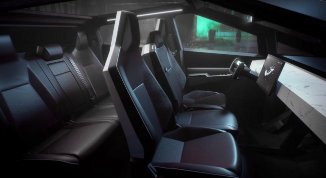 Интерьер кибергрузовика Tesla сделан тоже в достаточно футуристично-минималистком стиле: 2 ряда по 3 темных сиденья, центральный дисплей на абсолютно ровной приборной панели без лишних кнопок и руль, как у болидов Формулы-1.