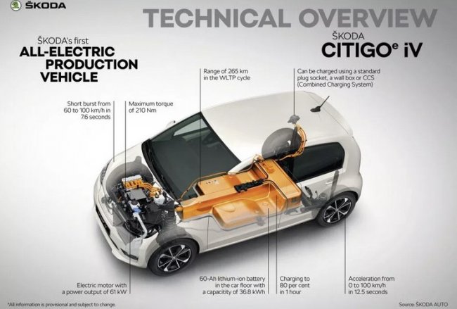 Согласно спецификациям производителя, мощность двигателя Skoda Citigo-e iV составит 61 кВт, что соответствует примерно 83 лошадиным силам. Силовая установка модели питается от литий-ионного аккумулятора на 36,8 кВт*ч. По ездовому циклу WLTP, полного заряда батареи электрокару хватит на преодоление расстояния до 265 км.