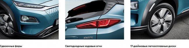 Характерными чертами Kona Electric является стильная фальшрешетка радиатора, под которой скрыт зарядный порт электромобиля и двухуровневая светодиодная головная оптика – особенность внедорожников Hyundai нового поколения. Чтобы добиться лучшей аэродинамики, конструкторы марки разработали для электрического кроссовера новые бамперы с дефлекторами и уникальный дизайн 17-дюймовых колесных дисков, которые позволяют эффективно отводить встречные потоки воздуха.