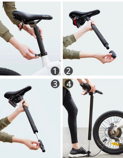 В трубку, на которою крепится сиденье велосипеда, встроен воздушный насос. Если вам понадобится накачать шины или поменять камеру, просто снимите сиденье и достаньте его.
