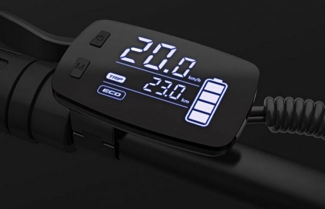 Глянцевый светодиодный дисплей на руле выглядит довольно привлекательно. Он вполне может соперничать с некоторыми из лучших аналогов от более крупных компаний (по крайней мере, по своему внешнему виду). Однако на нем отражается только общая информация — скорость, преодоленное расстояние, уровень заряда батареи. Других данных (например, ваттметра) там нет.