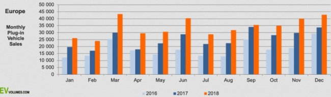 За 2018 год число автомобилей с полностью электрическими и гибридными силовыми установками на территории европейских стран выросло на 33% по сравнению с 2017 годом. В абсолютных значениях количество электрокаров в Европе увеличилось на 408 тысяч единиц.