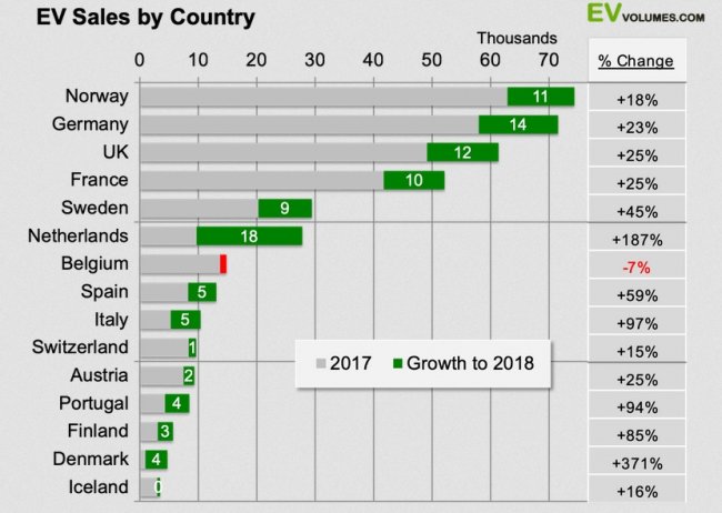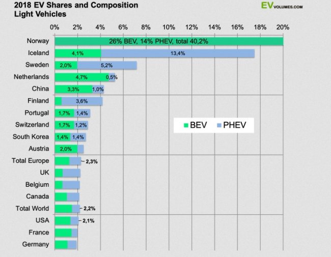 Стоит отметить, что практически все авторынки Европы показали рост в 2018 году. Лучше всего обстояли дела в Норвегии — в настоящее время 40% авторынка этой страны составляют электромобили и гибриды (26% и 14% соответственно). На втором месте идет Германия, на третьем – Великобритания.