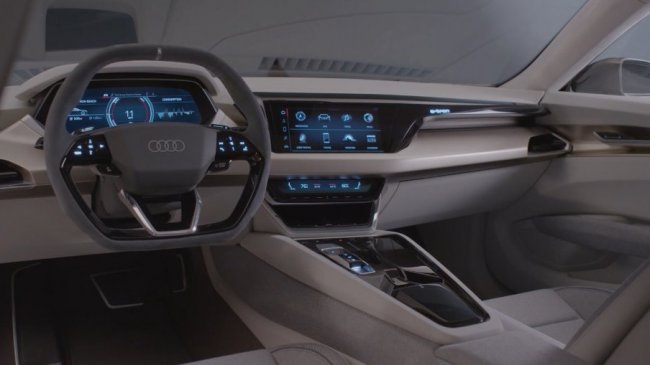 В кабине технологическая тема развивается тремя большими тач-скринами, которые продолжают тенденцию, наблюдаемую в e-tron Quattro. В центре приборной панели доминируют медиа дисплея, в то время как третий служит инструментальным кластером.