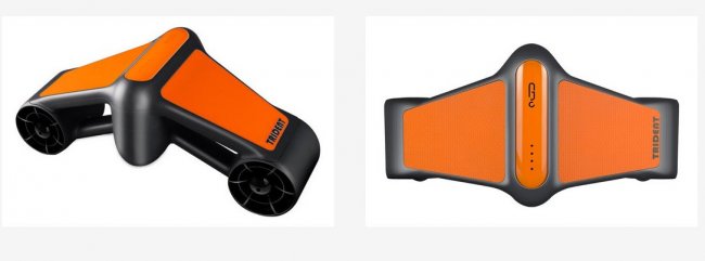 Подводный скутер Trident (не путайте с одноименным подводным дроном компании OpenROV) предназначен для погружения любителей дайвинга и снорклинга на глубину до 50 метров. Два винта создают тягу в 12 кг и позволяют ныряльщику выбирать между двумя скоростями – 3.6 км/ч или 7 км/ч; переключение режима осуществляется одним пальцем.