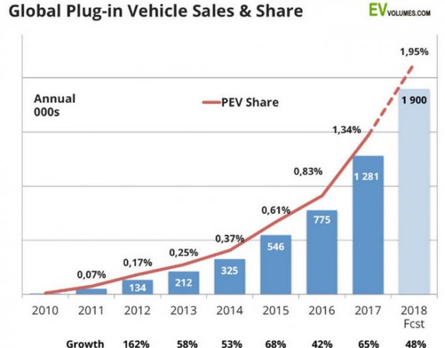 В первом квартале 2018 года в мире было продано 312 400 автомобилей с зарядкой от сети – на 59% больше, чем за аналогичный период прошлого года. Такие данные приводит ресурс ev-volumes.com, чья статистика учитывает глобальные продажи легковых электрокаров и плагин-гибридов, а также продажи легких коммерческих электромобилей в США и Канаде, Европе и Китае.