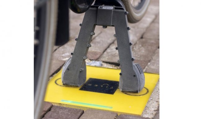 Для зарядки велосипед нужно поставить так, чтобы концы подножки опирались на два круга, обозначенные на плитке. При этом находящиеся внутри устройства катушки индуктивности автоматически включатся. За счет создаваемого ими электромагнитного поля электричество передается катушкам, встроенным в подножку, а от них — аккумулятору. О том, что зарядка пошла, покажет изменение цвета светодиодной полоски, размещенной на плитке, с зеленого на голубой.