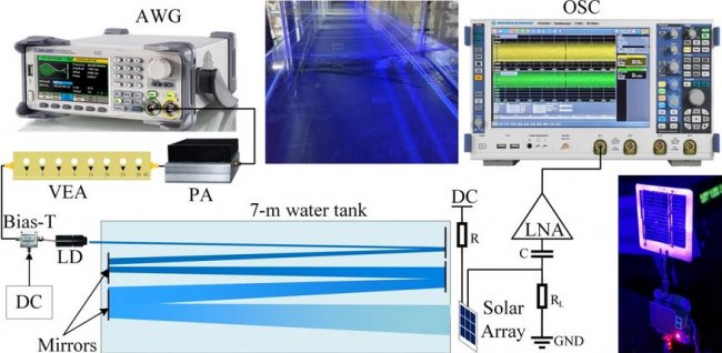 Исследователи протестировали новую конструкцию, в которой использовалась солнечная батарея 3×3 см для создания области обнаружения 3,4×3,4 см, в резервуаре с водой длиной 7 метров, который имитировал подводный канал. Зеркала использовались для увеличения длины пути оптического сигнала, создавая расстояние передачи 35 метров. Система показала надежность, стабильность, низкое энергопотребление и высокую производительность. По мере увеличения размера солнечной батареи с 1×1 до 3×3 см полоса пропускания по уровню −20 дБ увеличивалась с 4,4 МГц до 24,2 МГц.