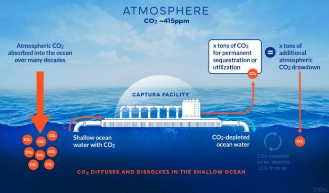 Принцип работы системы Captura основан на запатентованном процессе диализа морской воды. При помощи энергии от солнечных панелей очищенная вода из океана разделяется на жидкость и соль, она превращается в кислоту. Далее кислоту добавляют к такой же морской воде, что способствует выделению из нее углекислого газа. Он закачивается в резервуары для хранения, а очищенная вода сливается обратно в океан.