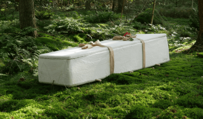 Компания Loop Biotech из Нидерландов готовится вывести на рынок новую форму контейнера для погребения человеческих тел под названием «Loop Living Cocoon». Она сделана из грибной массы и отличается тем, что полностью разлагается всего за 45 дней. Тело оказывается под землей в окружении питательной биомассы, на которой смогут произрастать другие растения и грибы.